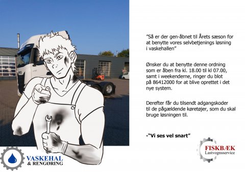 Vi synes, at det er vigtigt, at vores kunder altid kan få vasket deres lastvogne under ordentlige forhold. Vi har derfor åbnet for selvbetjening af vores vaskehal uden for de faste åbningstider, hvor du med et adgangskort frit kan benytte vores moderne og miljøvenlige vaskefaciliteter.